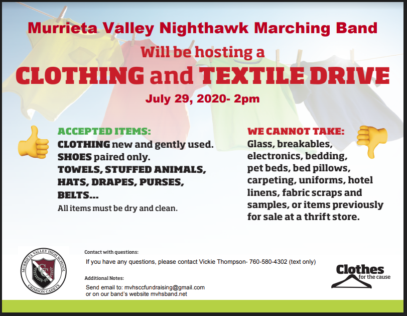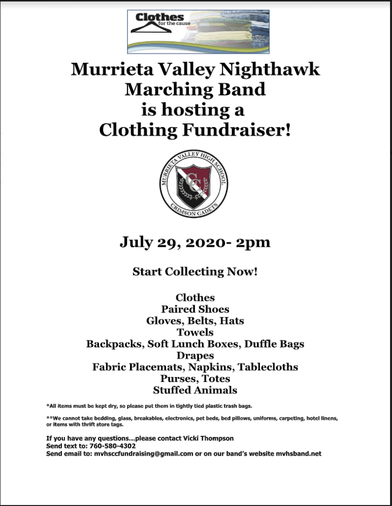 Happy Summer Everyone!!! I’m sure many of you have been using this time to clean out your closets and such…..hopefully;) For those of you returning this season, CFTC is already familiar to you. We had a fantastic turnout last year (exceeding 5000 lbs.), and decided to continue this fundraiser as a traditional band camp fundraiser and as way to kickoff the new season. New members and families: as you will learn at your first informational meeting, and throughout the season; fundraising is an essential part of our program. What better way to start off….than with a positive outlook of how our program works collectively as a team to reach its financial goals!! This years CFTC drive will be held during the first 3 days of band camp: July 27-29. Bags of donations will be accepted each day; at drop off, pickup, and throughout band camp hours. The CFTC truck will be arriving on the last donation day, July 29 @2pm. Please view the flyers and instructions for additional information. If you have any questions, please feel free to contact me: Vicki Thompson, Ways and Means Co-Chair, mvhsccfundraising@gmail.com, or text 760-580-4302. HAPPY CLEANING!!!