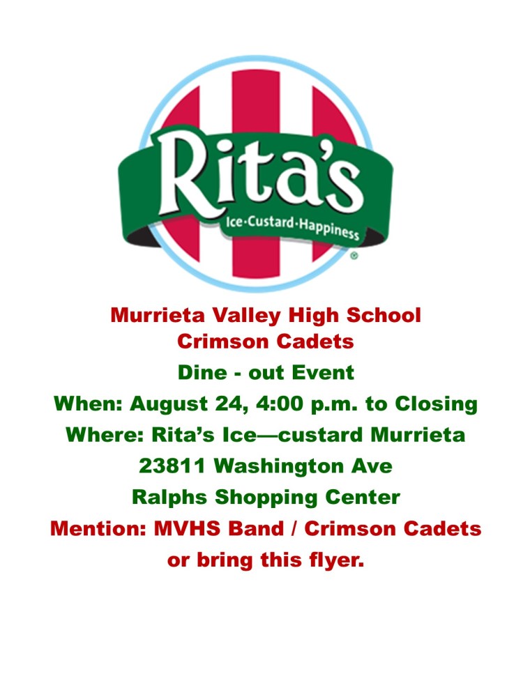 Cool off with a sweet treat at Rita’s Italian Ice on Thursday August 24 from 4pm to closing to support the band.