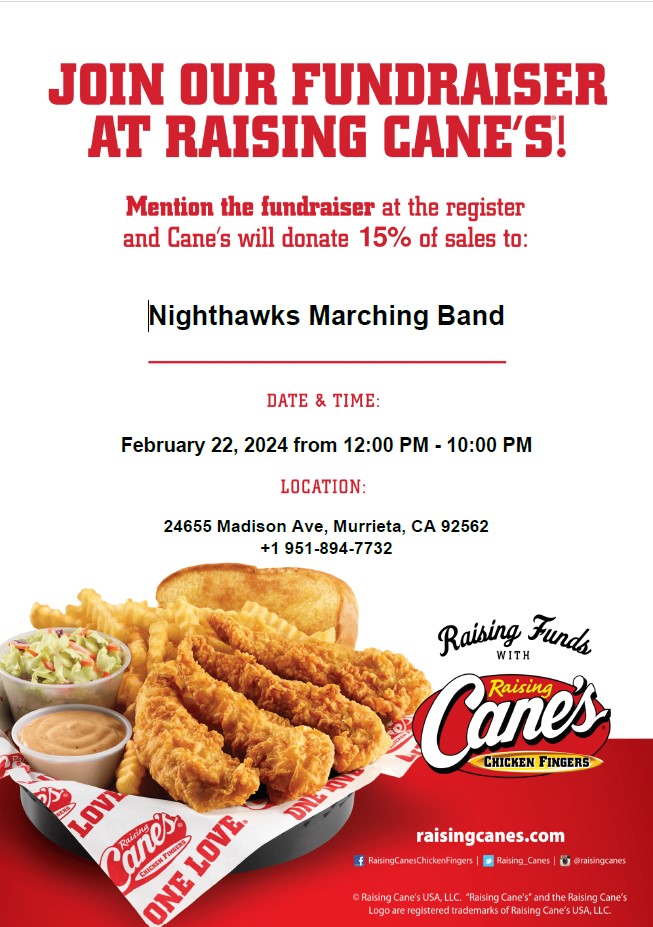 Head to Raising Cane’s on Madison Avenue on Thursday February 22 between noon and 10pm and be sure to mention the Nighthawks Marching Band. They will donate 15% of all purchases to support our Crimson Cadets.