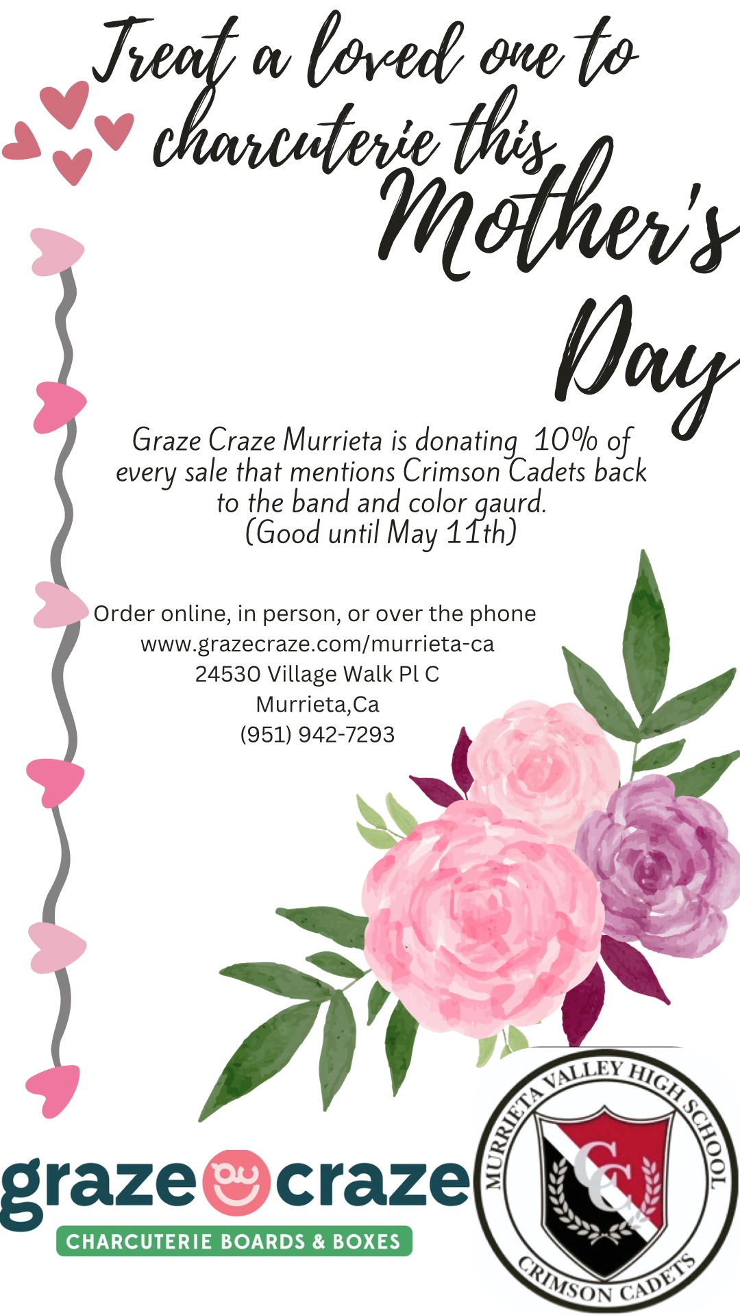 We have partnered with GrazeCraze in Murrieta to bring you our next band fundraiser just in time for Mother’s Day!