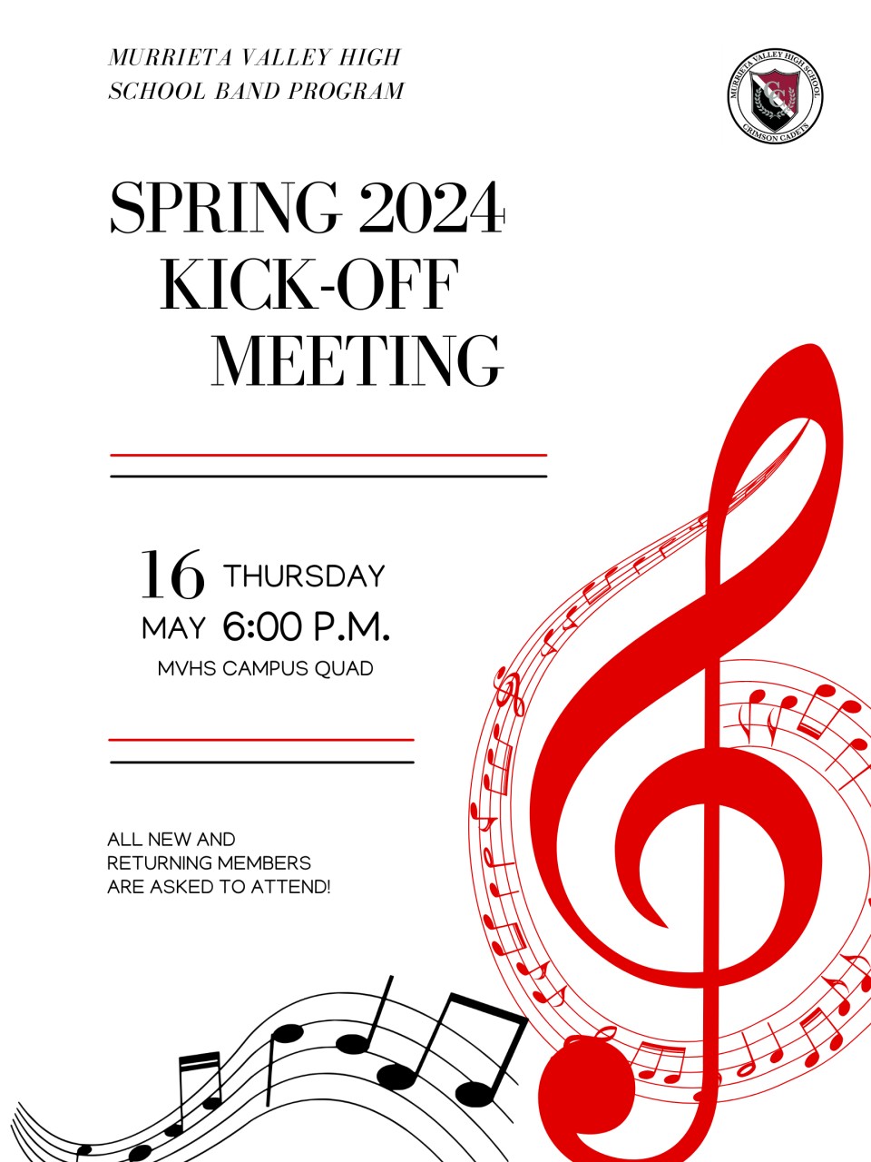 The Crimson Cadets will be kicking off the 2024 Marching Band Season with the annual Kick-Off Meeting on Thursday May 16th in the Quad.