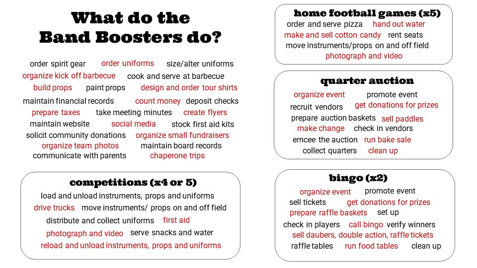 For information regarding our booster program, please read our Band Constitution and Bylaws. If you have any further questions, please feel free to contact any of your booster board members.